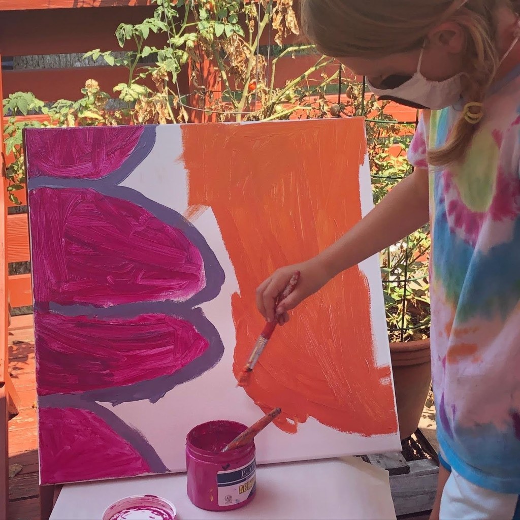 We made BIG bright paintings inspired by Georgia O’Keefe’s work (and painted some of my deck as well)