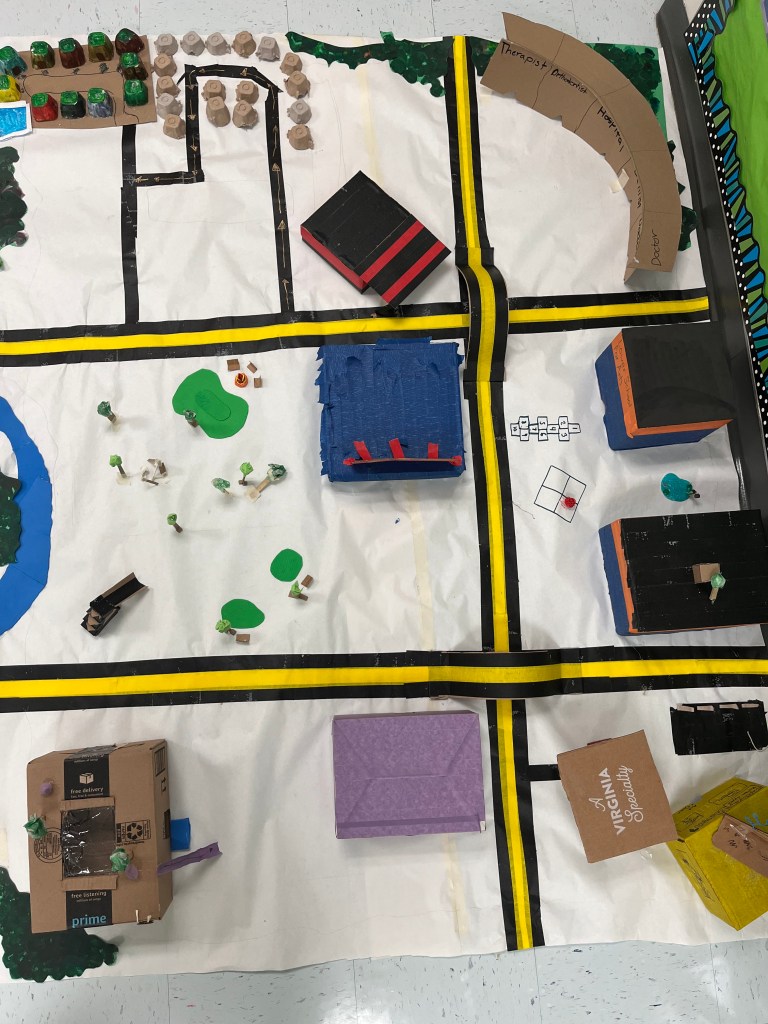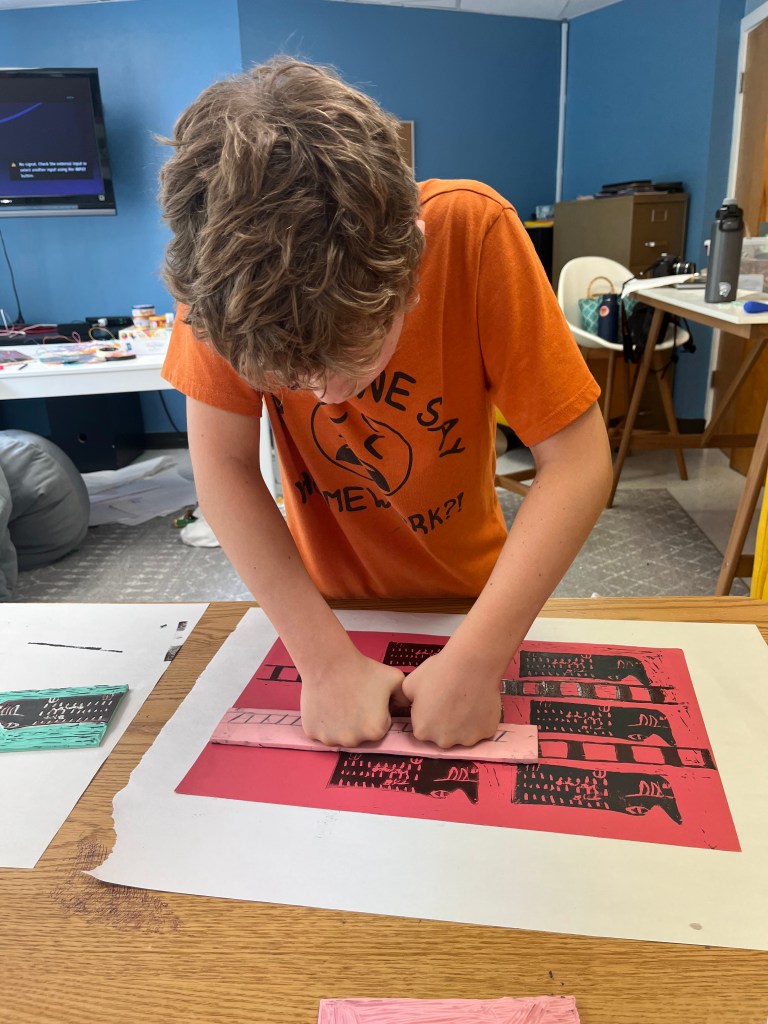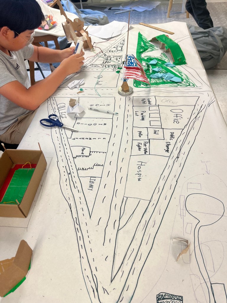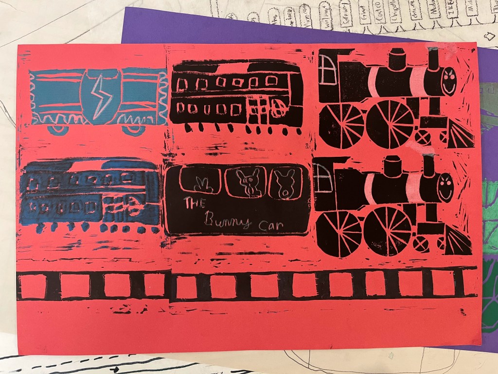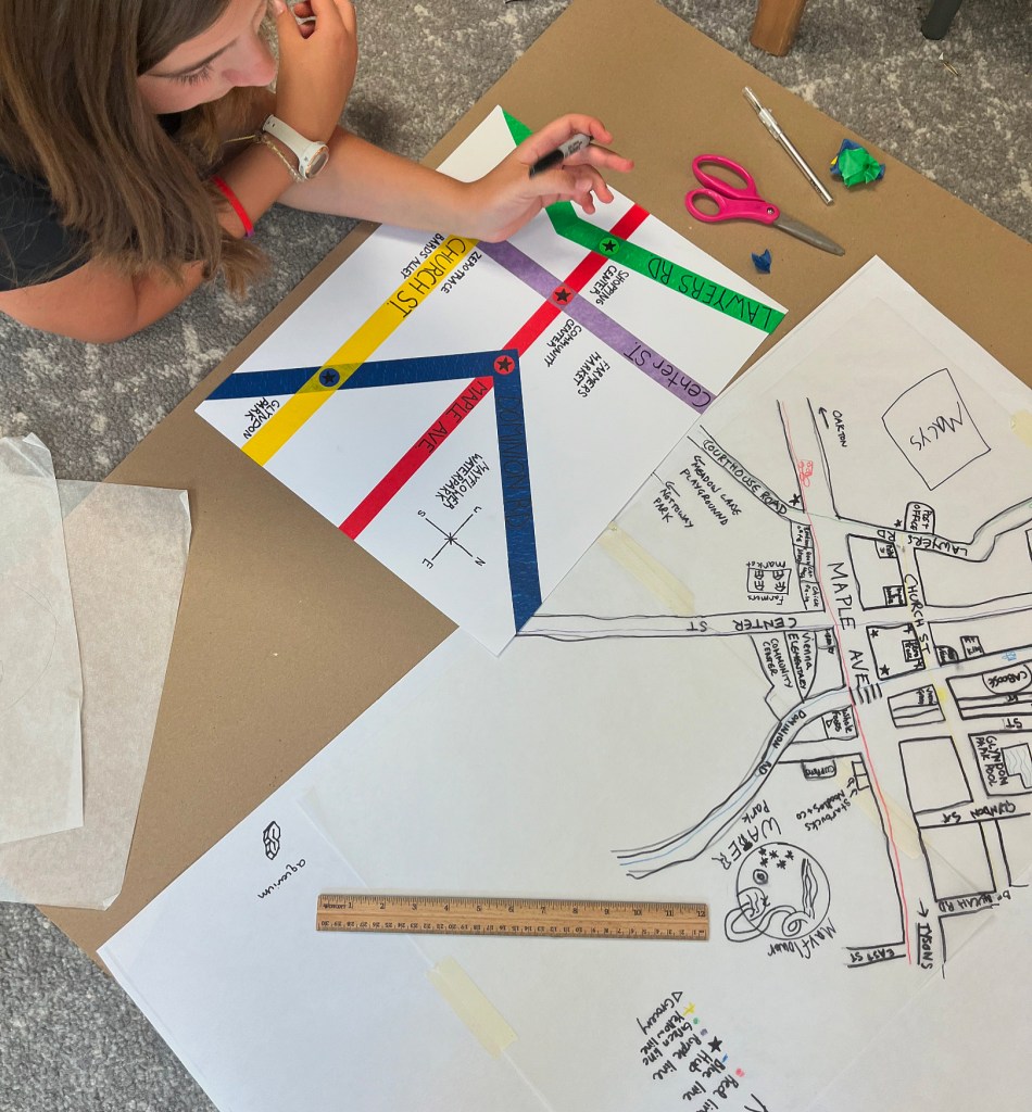 Transit Design and Urban Planning. Campers discussed the role of public transport and analysed various transit systems from around the world. They then looked at their own communities and designed public transit systems that would work within these. They then produced easy to read topographic maps for their transit systems. Following this, they worked in groups to plan out their own towns and design maps of them. At the end of the week, students took part in a printmaking project, where they designed train cars and printed them as a group, combining their designs to make vehicles.