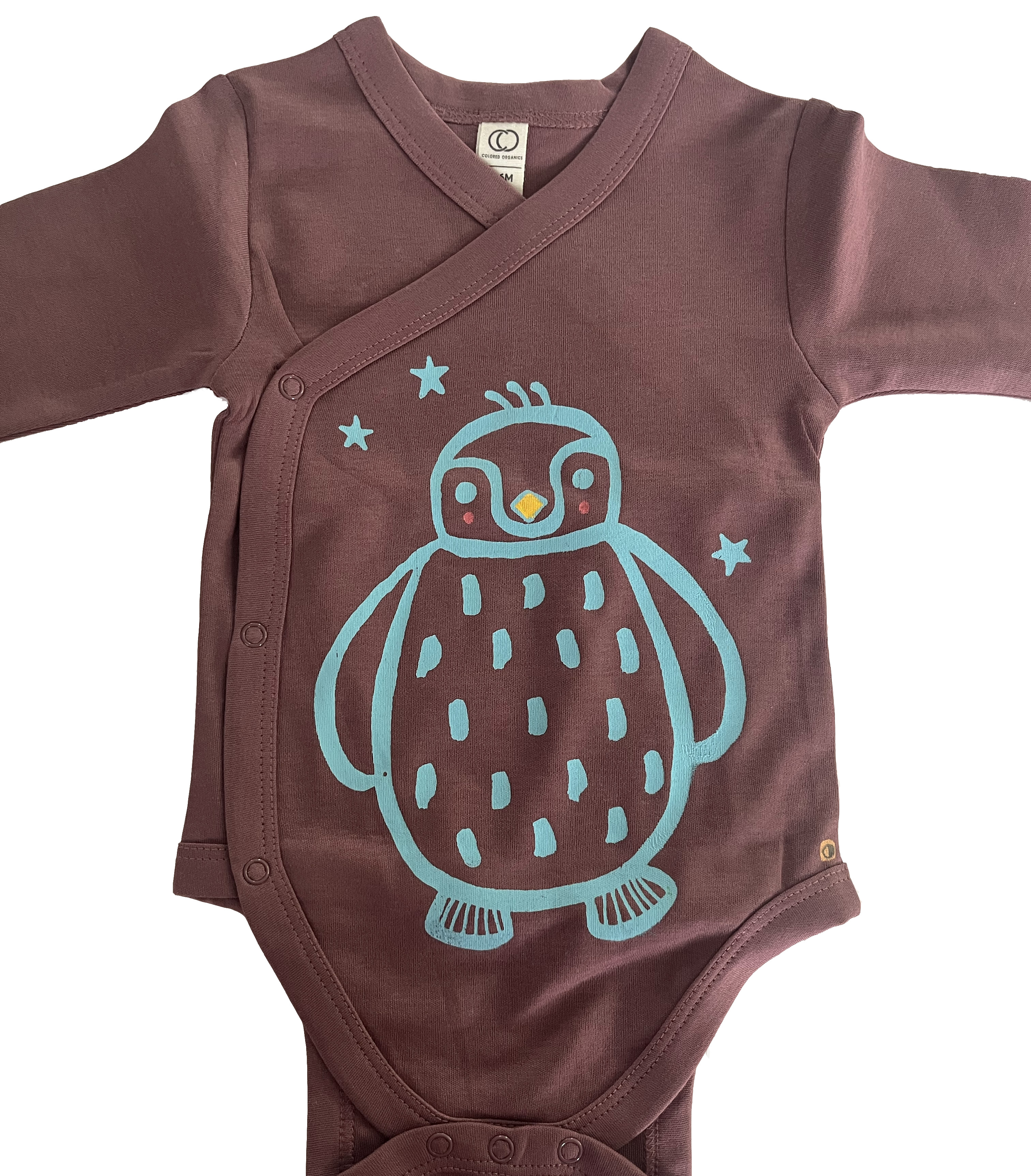 Hand screen printed, heat set, long sleeved soft cotton organic onesie with hand painted detail.