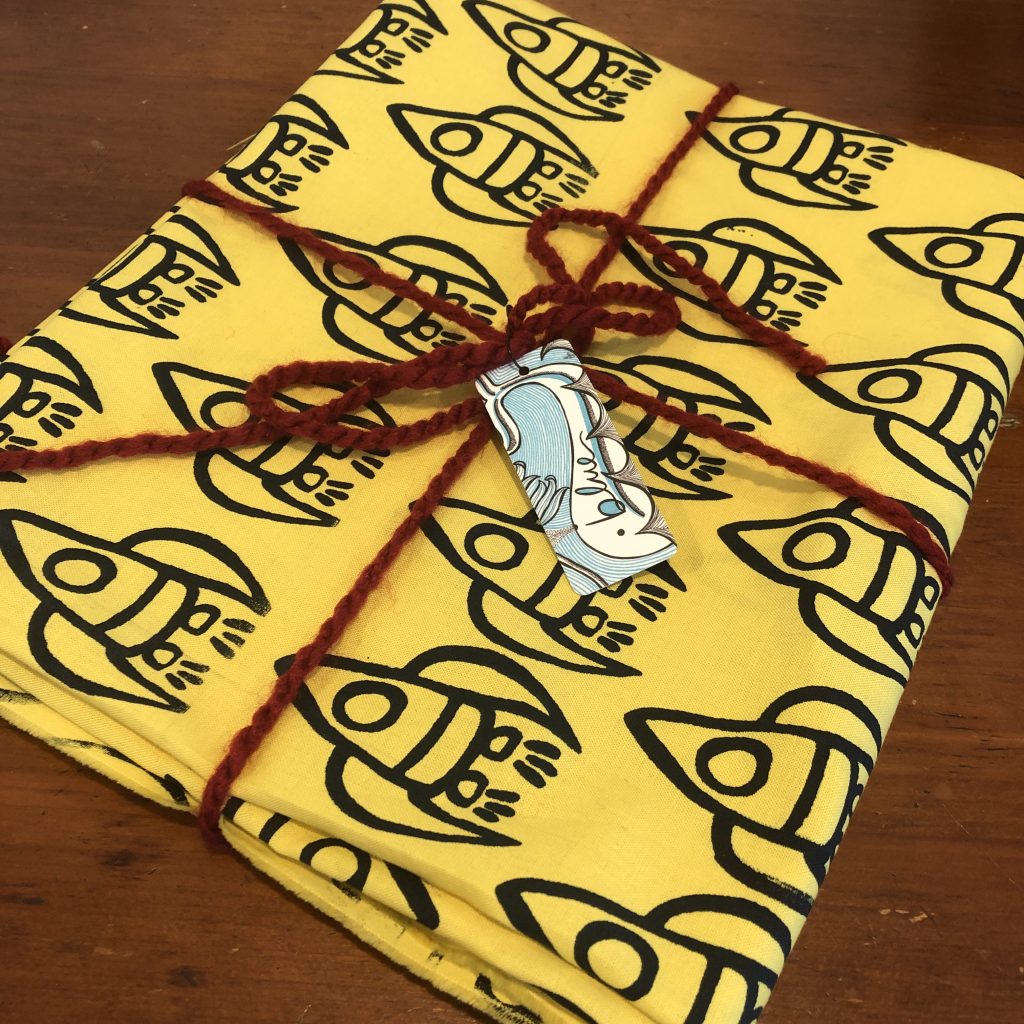 A yard of handprinted 100% Kona Cotton. Screen printed navy rockets on banana pepper yellow. sold by the yard.